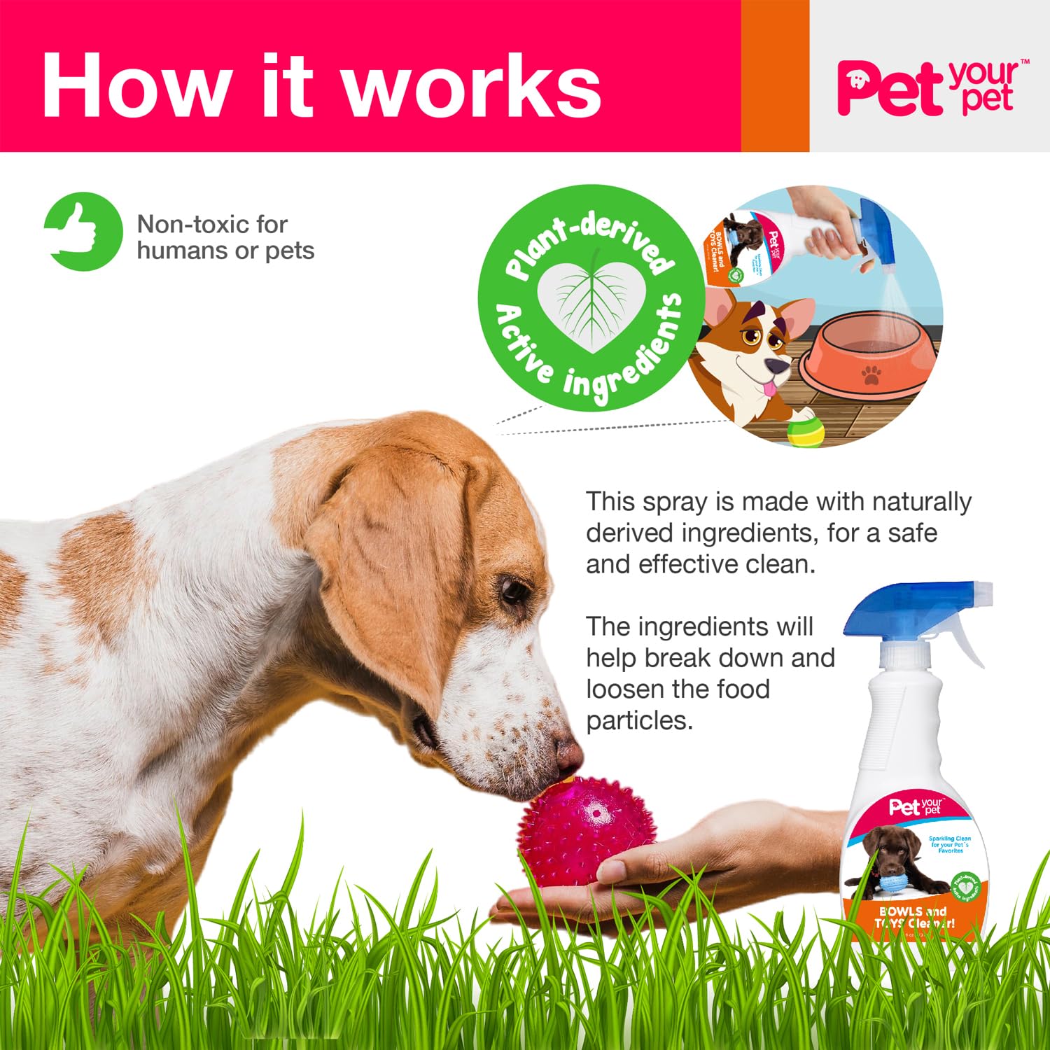 - HASSLE-FREE NATURAL CLEANING SPRAY: Simplify your cleaning routine with our easy-to-use spray cleaner. Designed to tackle tough stains and odors, it's the ideal solution for all pet messes, ensuring your pet's bowls and toys are always ready for use