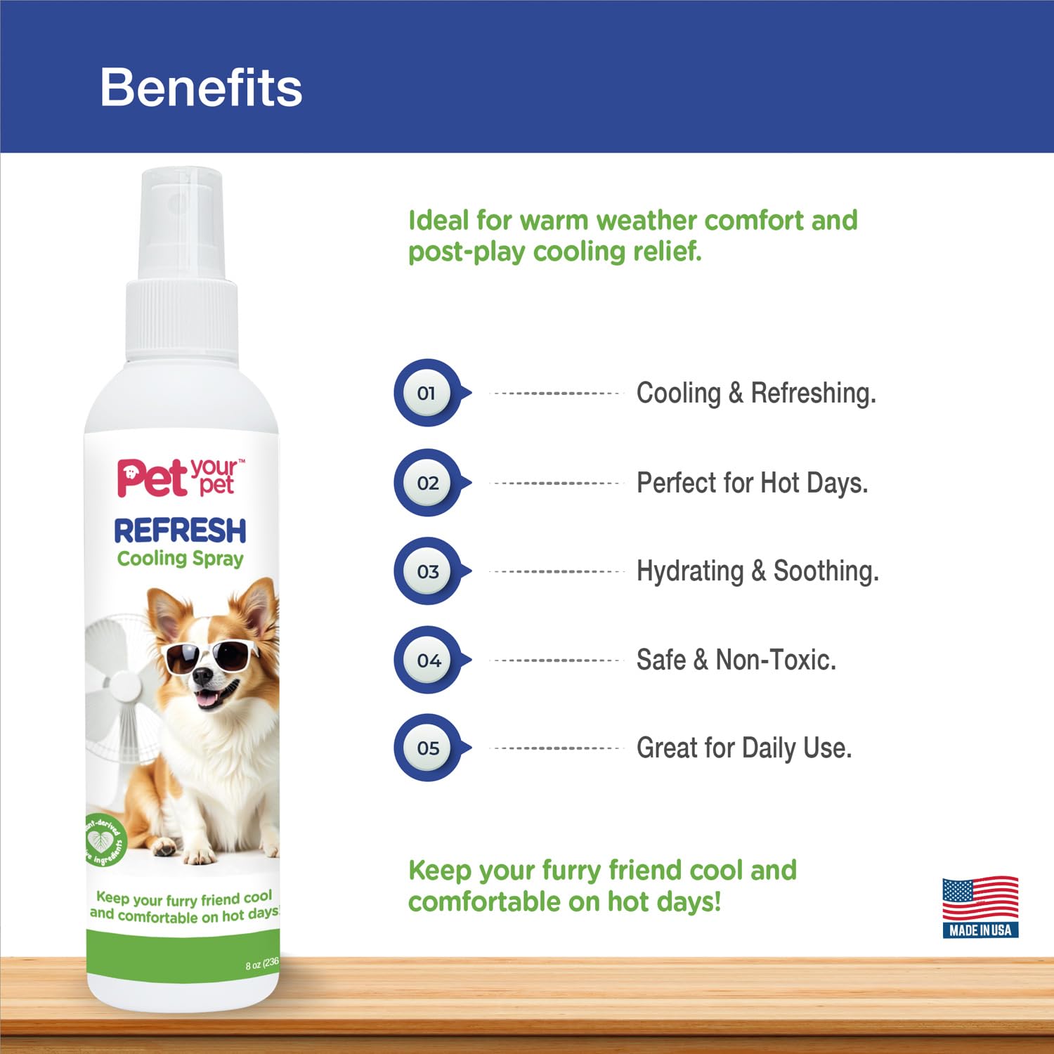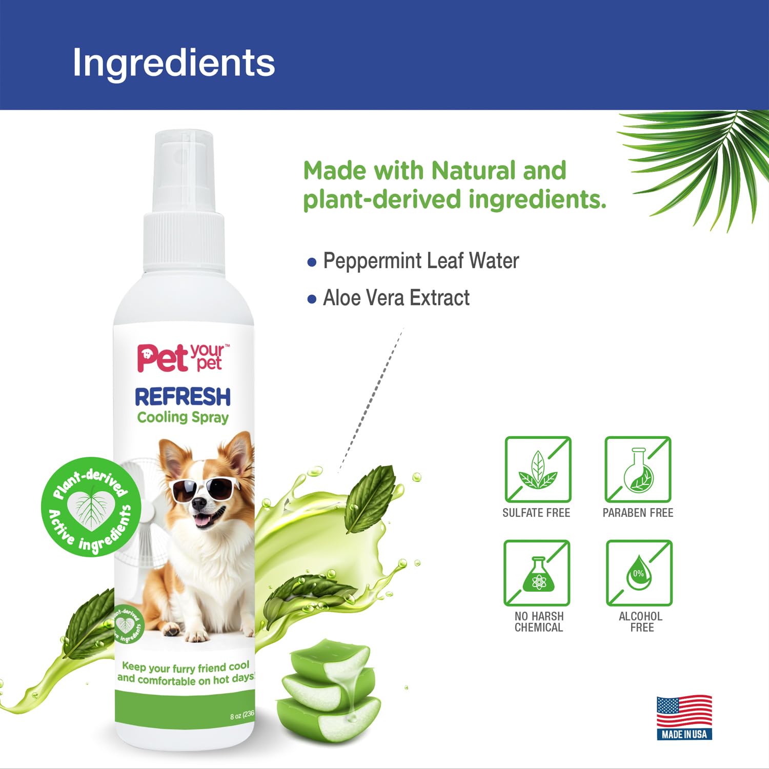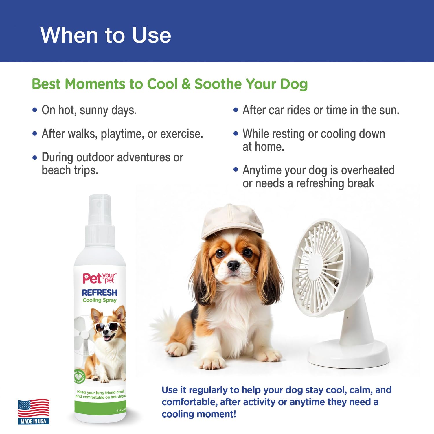 - SAFE, NON-TOXIC FORMULA MADE IN USA: This pet cooling spray is non-toxic and safe for dogs of all sizes. Crafted with care in the USA, it's gentle on your pet's skin and ideal for daily use to keep them feeling fresh and cool.