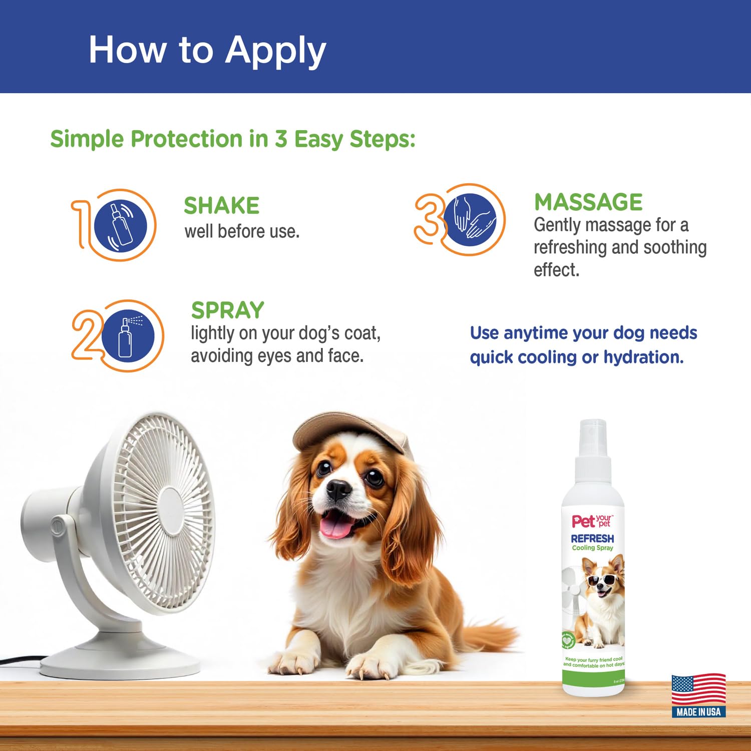 - EASY-TO-USE DAILY REFRESHER: A quick spritz is all it takes to refresh and hydrate your dog's coat, leaving them feeling revitalized. No need for a bath, just spray and go! This cooling mist is great for everyday use, helping to keep your pet cool during daily activities.